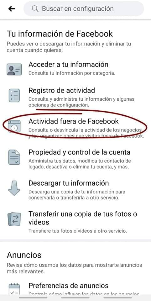 Nos saldrá una nueva ventana, en la cual tenemos que irnos hasta la parte inferior, en la sección "Tu información de facebook" y seleccionamos la opción "Actividad fuera de Facebook".